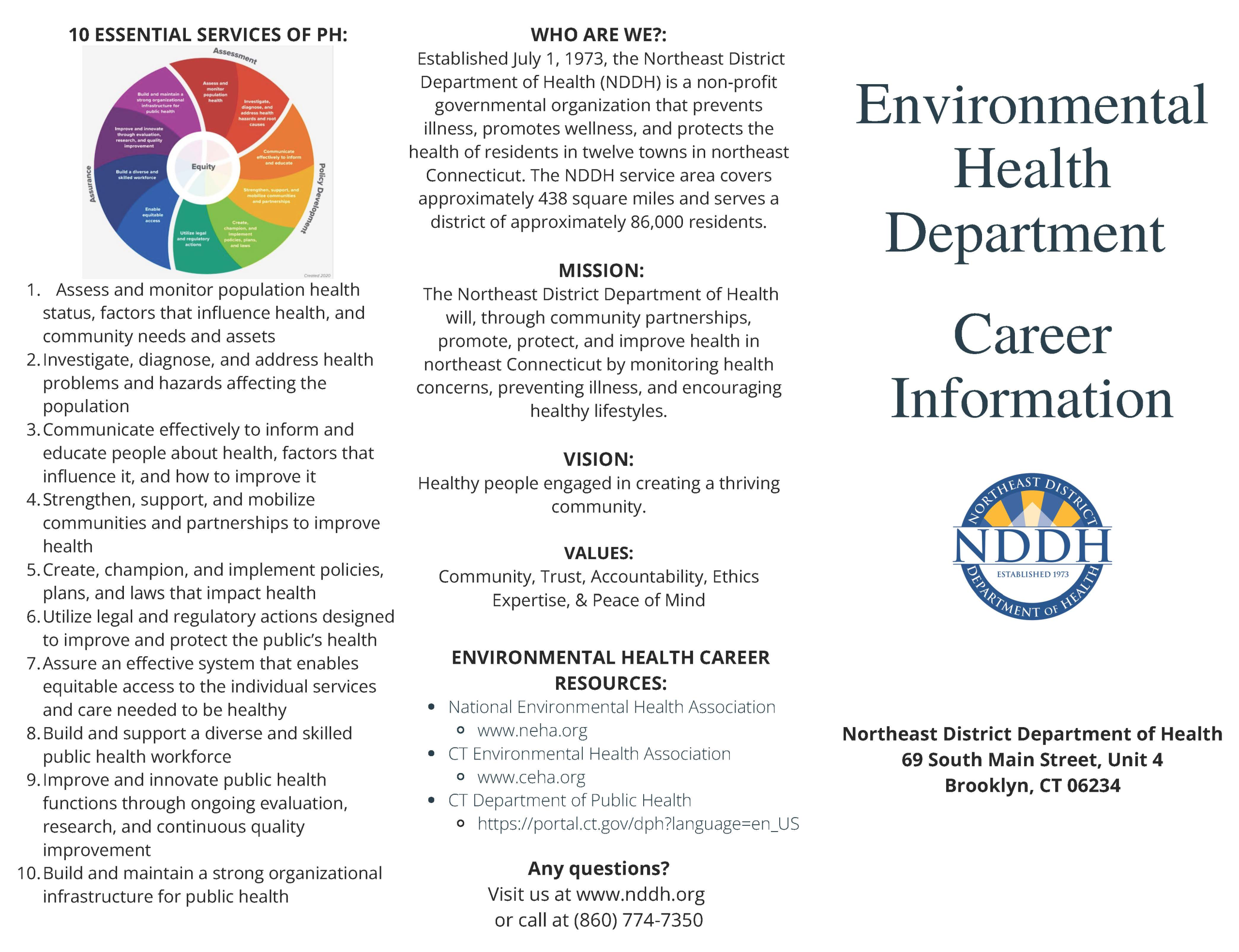 The Northeast District Department of Health is an equal opportunity employer, and seeks to secure and retain well-qualified employees to carry out agency programs effectively and efficiently. As a member of the NDDH team, each employee contributes their individualized talents and energies to fulfill the mission of our agency and further improve the health of our community and environment.
